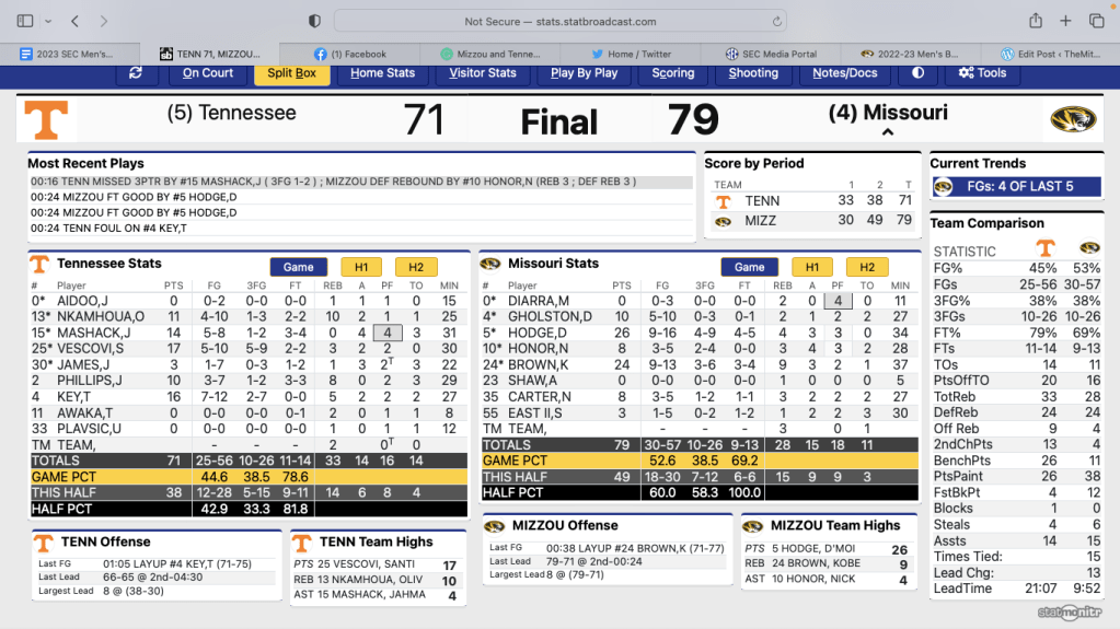 In the first half, Missouri and Tennessee seemed destined to remain deadlocked. Jahmai Mashack nailed a three as time expired to give the Volunteers a 33-30 lead over Missouri at the break.